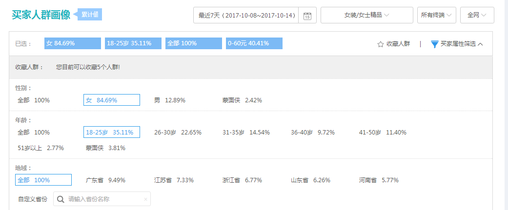 最后,我们也可以根据生意参谋(专业版才有)里边的人群画像来投放人群会比较精准一些。