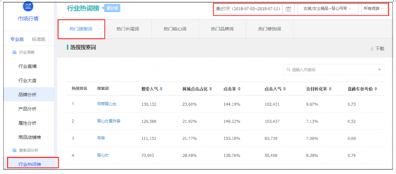 打开你的生意参谋(标准版以上),然后在市场功能模块,有一个搜索词分析,然后你点击一下行业热词榜,选择你要经营的类目,看最近7天的数据(不要看一天的,因为一天的数据还是有比较大的偶然性的),比如我们看一下女装的背心吊带类目。